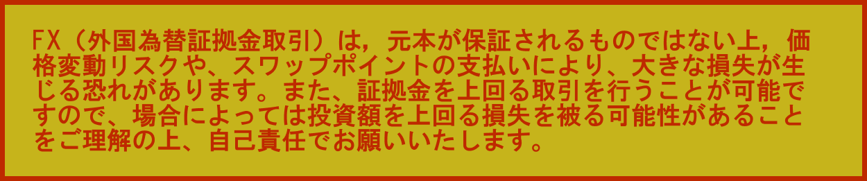 FX(外国為替証拠金取引)は価格変動リスクや、スワップポイントの支払いにより、損失が生じる恐れがあります。また、証拠を上回る取引を行うことが可能ですので、場合によっては投資額を上回る損失を被る可能性があります。FX(外国為替証拠金取引)には取引業者の売買手数料がかかります。当システムの効果には個人差があります。このシステムを参考にした金融商品などへの投資にはリスクが伴うことをご理解の上、自己責任でご使用いただきます。また、本サービスによってお客様に生じた損害について当社は一切の責任を負いません。